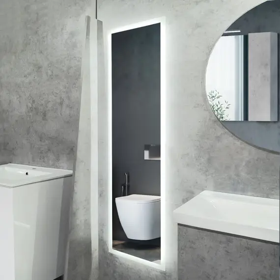 Вертикальное ростовое зеркало для ванной комнаты с Led подсветкой. Высококачественное зеркальное полотно с амальгамой на основе серебра. Зеркало оборудовано ореольной и фронтальной Led подсветкой с бесконтактным включателем со встроенной функцией регулировки яркости. Температура подсветки: 6000-6500К холодная.