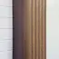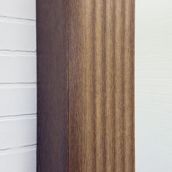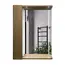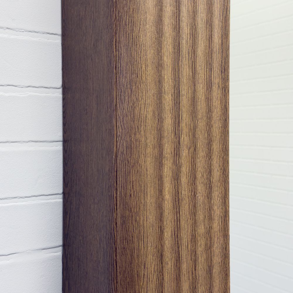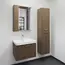 Зеркальное высококачественное полотно с амальгамой на основе серебра. Правая боковая фасадная панель декорирована вертикальной фрезеровкой. За боковой панелью две полки доступ к которым осуществляется со стороны зеркала. В модели применяется декоративная плёнка с эффектом Soft-Touch с тиснением под текстуру дуба.