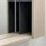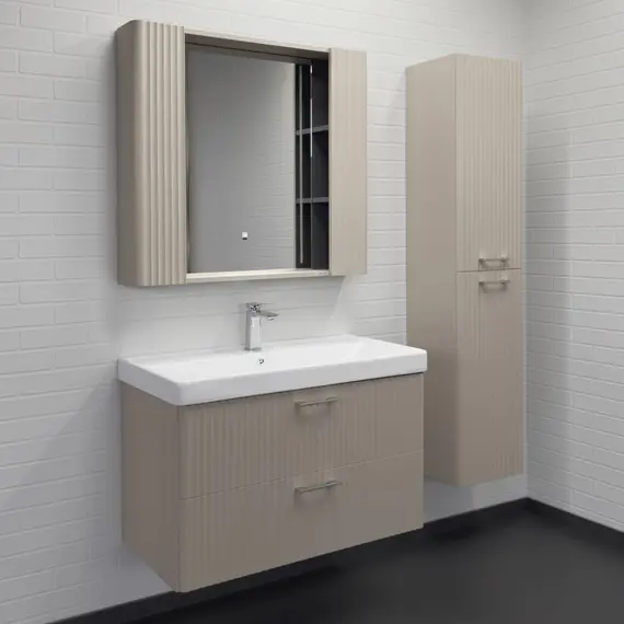 Зеркальное высококачественное полотно с амальгамой на основе серебра. Боковые фасадные панели декорированы вертикальной фрезеровкой. За каждой из боковых панелей по две полки доступ к которым осуществляется со стороны зеркала. В модели применяется декоративная плёнка с эффектом Soft-Touch с тиснением под текстуру дуба.