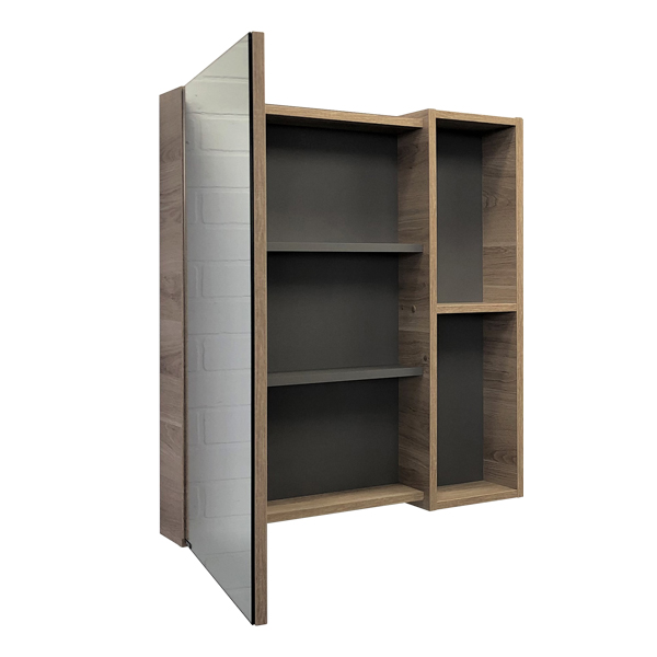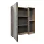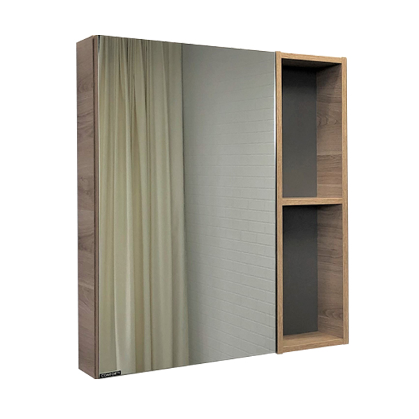 Высококачественное зеркальное полотно с амальгамой на основе серебра. Створка оснащена петлями с плавным закрыванием. Петли у створки снаружи. За зеркальной створкой одна горизонтальная полка, в пространстве открытого хранения - две. Зеркало-шкаф универсально - может быть подвешено в правом и левом варианте.