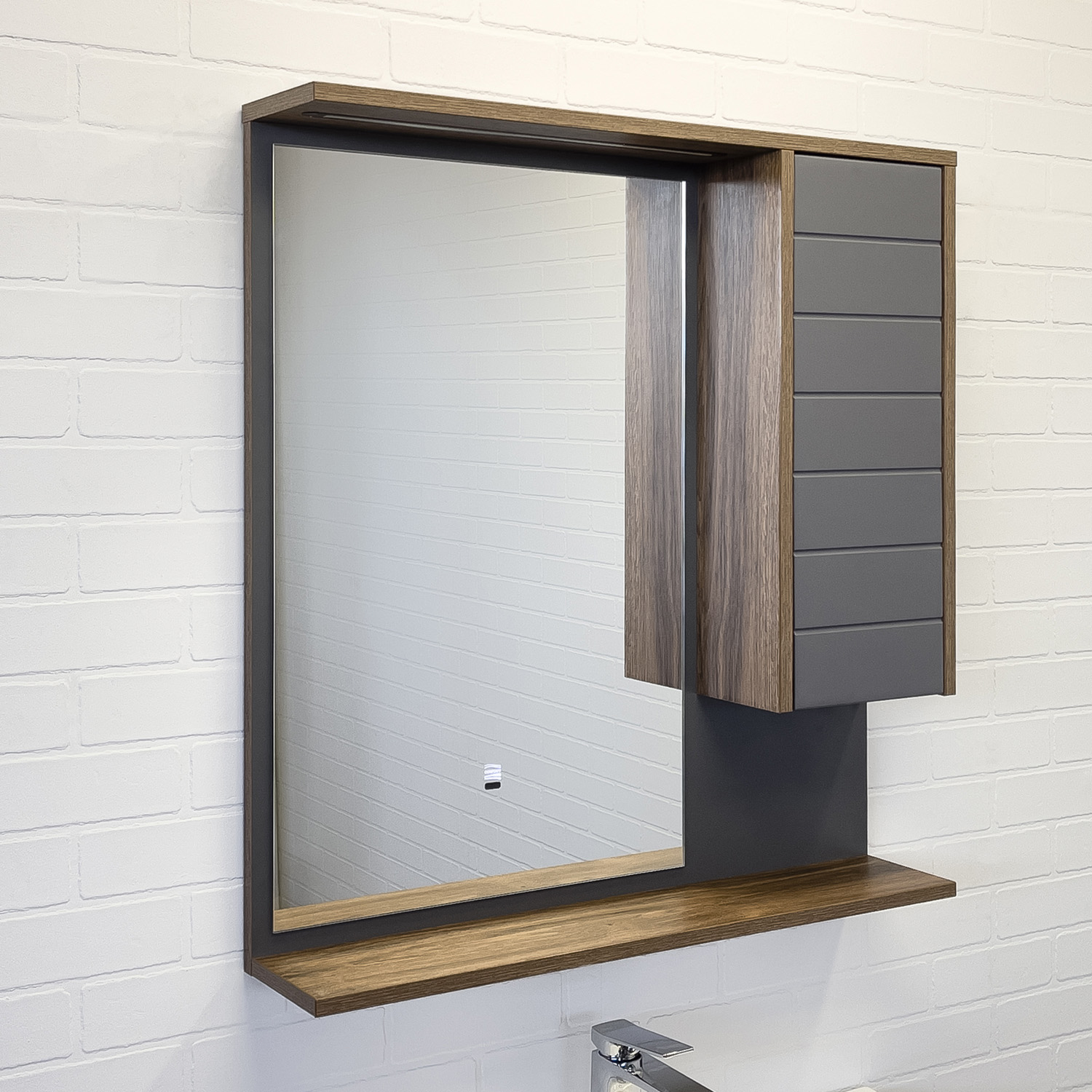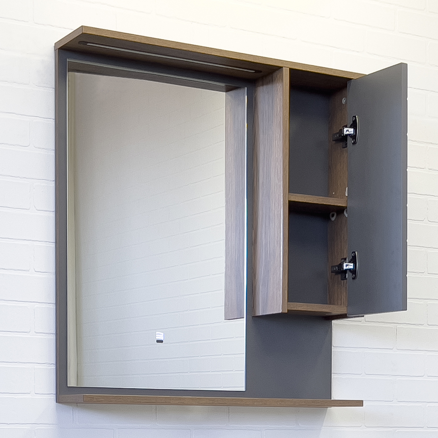 Зеркальное высококачественное полотно с амальгамой на основе серебра. За дверцей одна горизонтальная полка. Удобная полочка для размещения принадлежностей для умывания. В верхней полочке установлен LED светильник. Выключатель подсветки бесконтактный со встроенной функцией регулировки яркости. Температура подсветки: 6000-6500К холодная. Фасад зеркального шкафа изготовлен из МДФ и облицован в пленку цвета антрацит.