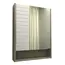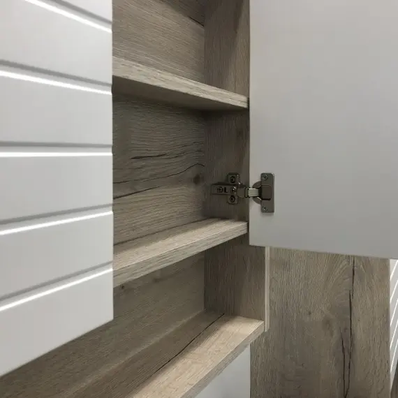 Правый широкий фасад - зеркальный. Высококачественное зеркальное полотно с амальгамой на основе серебра. Обе боковые створки шкафа открываются наружу. За широкой створкой две горизонтальные полки, за узкой одна. На нижней внешней полке можно расположить невысокие принадлежности для умывания.