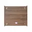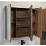 Корпус шкафа из влагостойкого ЛДСП Дуб темно-коричневый. Обе боковые створки зеркала открываются наружу. У средней центральной секции петли справа. За широкой створкой две горизонтальные полки, за узкими по одной.
