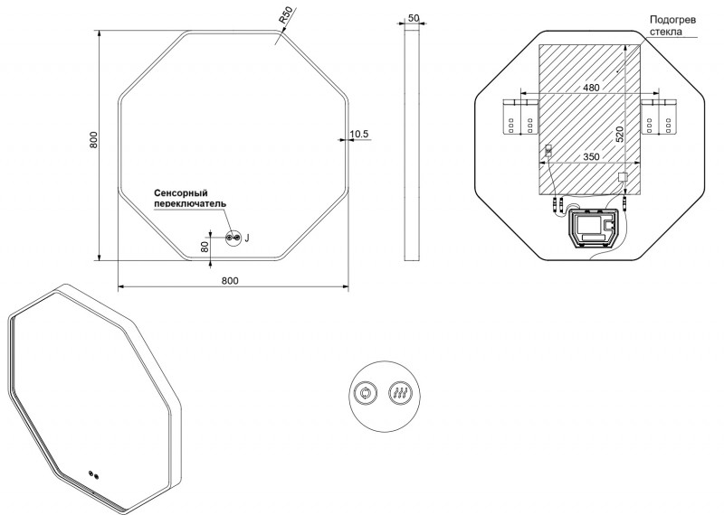 - Двойной выключатель: регулировка цветовой температуры (2700-6500К) и подогрев полотна;