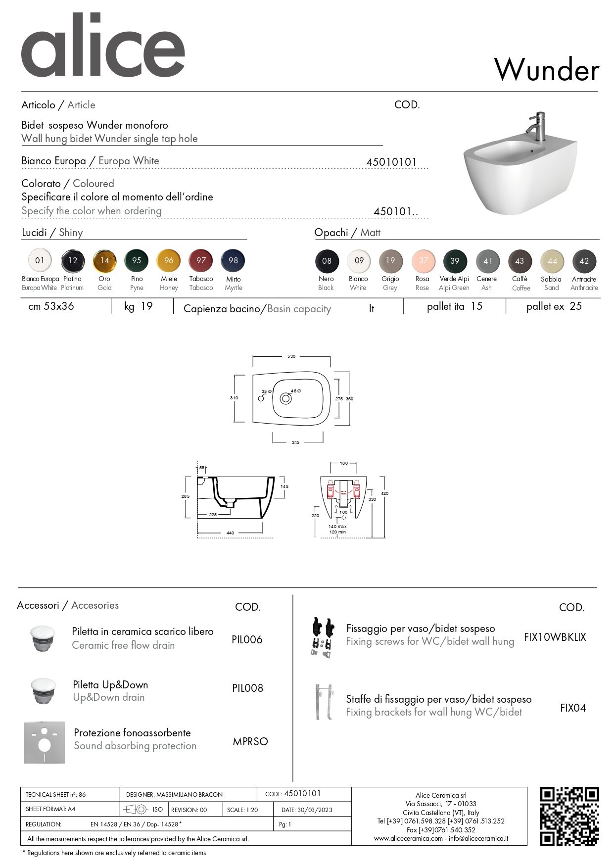 Подвесное биде c крепежом Alice Wunder FIXwunder, 53x36 см, белый глянцевый