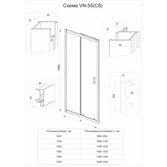 Душевая дверь Veconi Vianno VN-55G, 1100x1950, Золото брашинг, стекло прозрачное
