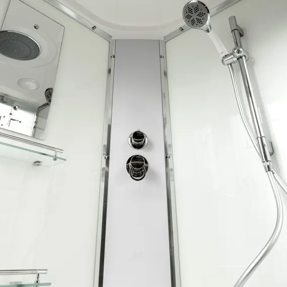 Стильная душевая кабина с внутренней сборкой AvaCan EM 5012 L сочетает в себе высокую функциональность, практичность и надежность. Для изготовления применяют безопасное закаленное стекло толщиной 5 мм, надежно фиксируемое алюминиевым профилем. Цвет профиля хром. В комплекте зеркало, донный клапан (клик-клак), переключатель режимов, смеситель, тропический (верхний) душ, полочки,сифон.