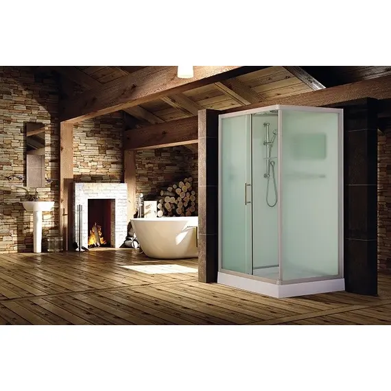 Низкий поддон. Сифон с гидрозатвором. Стекло: 5 мм, переднее - "матовое". заднее - "белое крашеное" с интегрированным зеркалом 65х30. Комплектующие: полочка со стаканчиком, смеситель, 3-х режимная душевая лейка на стойке, мыльница, двойные ролики. Модель "СКR" - квадратная/прямоугольная кабина со стеклянной крышей, верхним душем с прорезиненными соплами и вентиляционным отверстием.