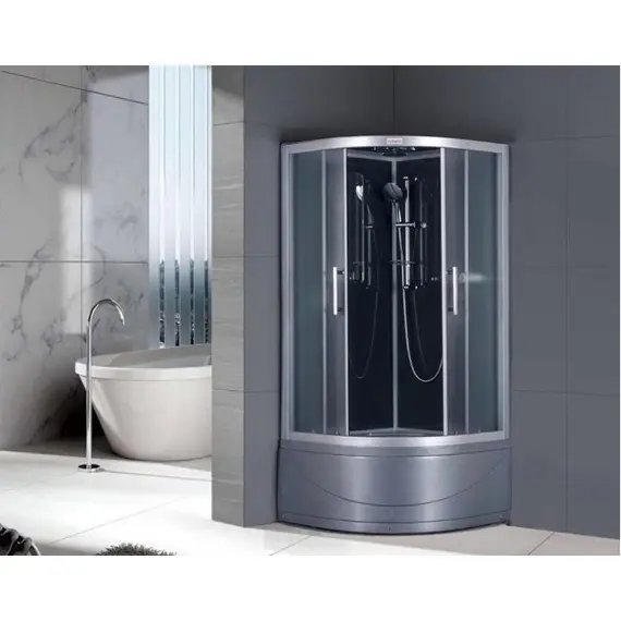 Высокий поддон. Сифон с гидрозатвором. Стекло: 5 мм, переднее - "матовое". заднее - "cерое крашеное" с интегрированным зеркалом 65х30. Комплектующие: полочка со стаканчиком, смеситель, 3-х режимная душевая лейка на стойке, мыльница, двойные ролики. Модель "СRB" - угловая кабина с высоким поддоном, стеклянной крышей, верхним душем с прорезиненными соплами и вентиляционным отверстием.