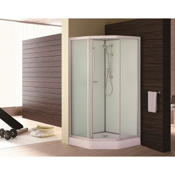 Низкий поддон. Сифон с гидрозатвором. Стекло: 5 мм, переднее - "матовое". заднее - "белое крашеное" с интегрированным зеркалом 65х30. Комплектующие: полочка со стаканчиком, смеситель, 3-х режимная душевая лейка на стойке, мыльница, двойные ролики. Модель "PR" - пятиугольная кабина со стеклянной крышей, верхним душем с прорезиненными соплами и вентиляционным отверстием.