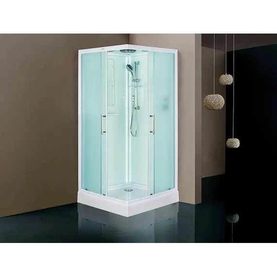Низкий поддон. Сифон с гидрозатвором. Стекло: 5 мм, переднее - "матовое". заднее - "белое крашеное" с интегрированным зеркалом 65х30. Встроенная LED подсветка. Профиль: алюминий. Цвет: БЕЛЫЙ. На кабинах установлены: панель управления, вытяжной вентилятор, верхний душ с резиновыми соплами, FM радио. Комплектующие: стеклянная крыша, полочка со стаканчиком, смеситель, 3-х режимная лейка на стойке, мыльница, двойные ролики. Модель: "СКR" - квадратная.
