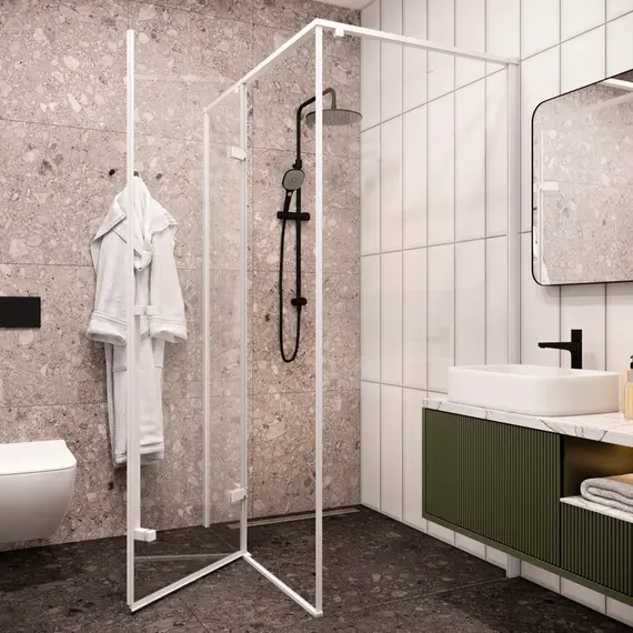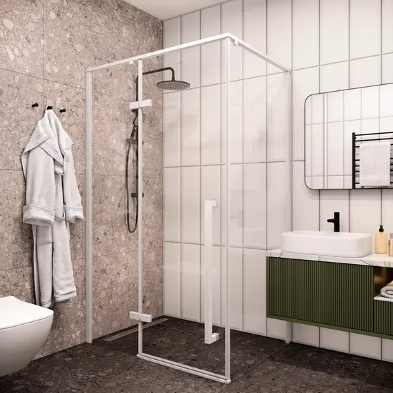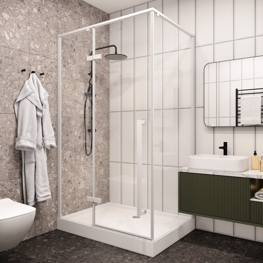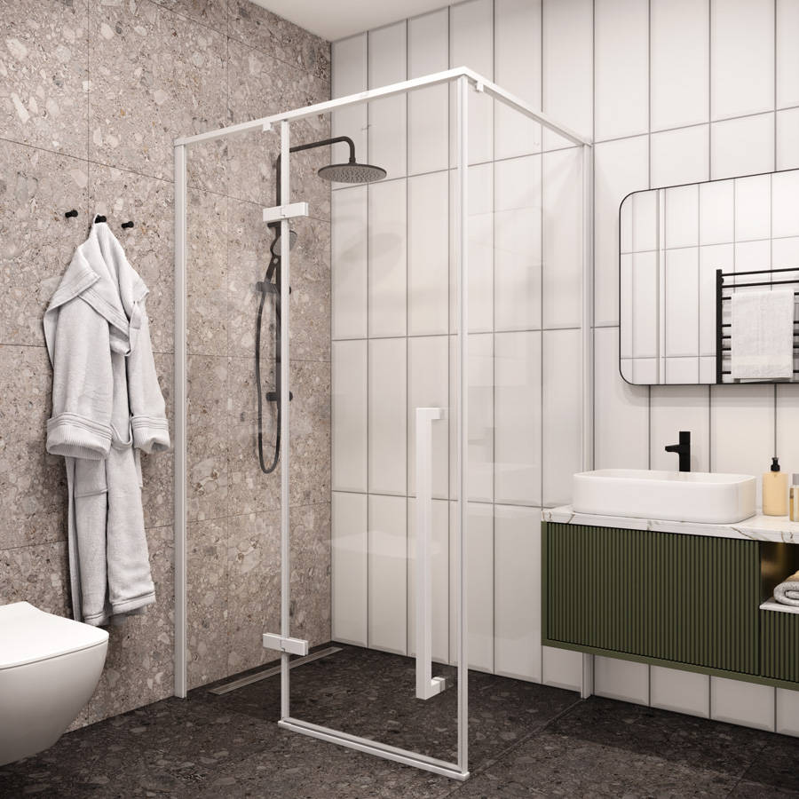 - Белый профиль и прозрачное стекло подчеркнут стильный дизайн санузла. Прочная ручка выполнена из stainless steel. Удлиненная форма ручки подчеркивает эстетику уголка и удобна для использования людьми разного роста.Стекла — закаленные, прозрачные, толщиной 8 мм;Дверь — распашная, образует широкий вход;