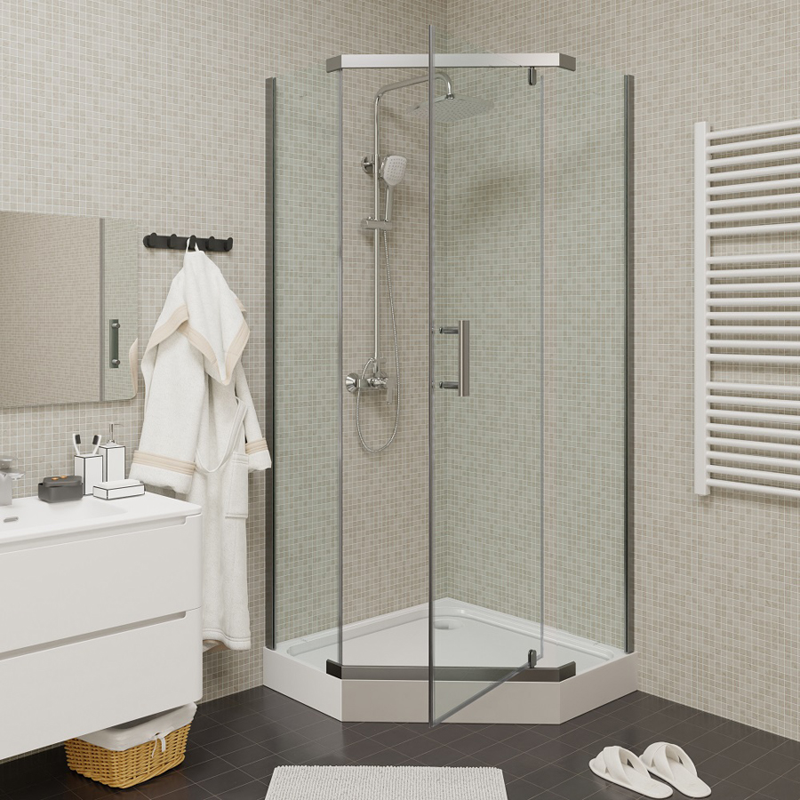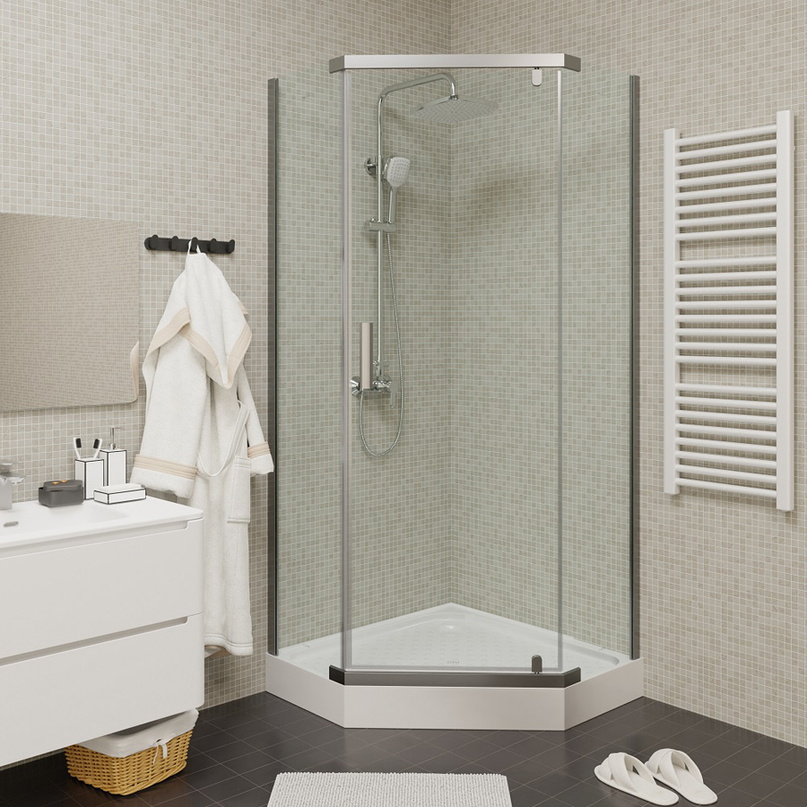 Размер: 90х90х192 смСтильный уголок пятиугольной формы с распашной дверью. Прозрачное стекло и полированный профиль придают модели визуальную легкость. Уголок не утяжеляет пространство и хорошо дополняет любое оформление ванной комнаты.