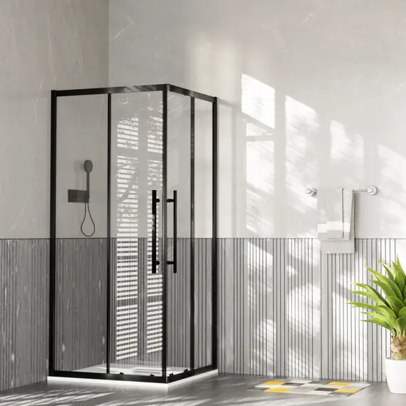 Стекло: 6 мм. ("Easy Clean"). Профиль (40 мм). Заглушки в цвет вертикальных профилей. Антибрызговики (4 шт). 2-двери, алюминиевые профили с магнитным шнуром на дверях, 2-ые верхние и нижние ролики, стальные ручки (44 см) в цвет профиля. Пристенные регулировочные профили.