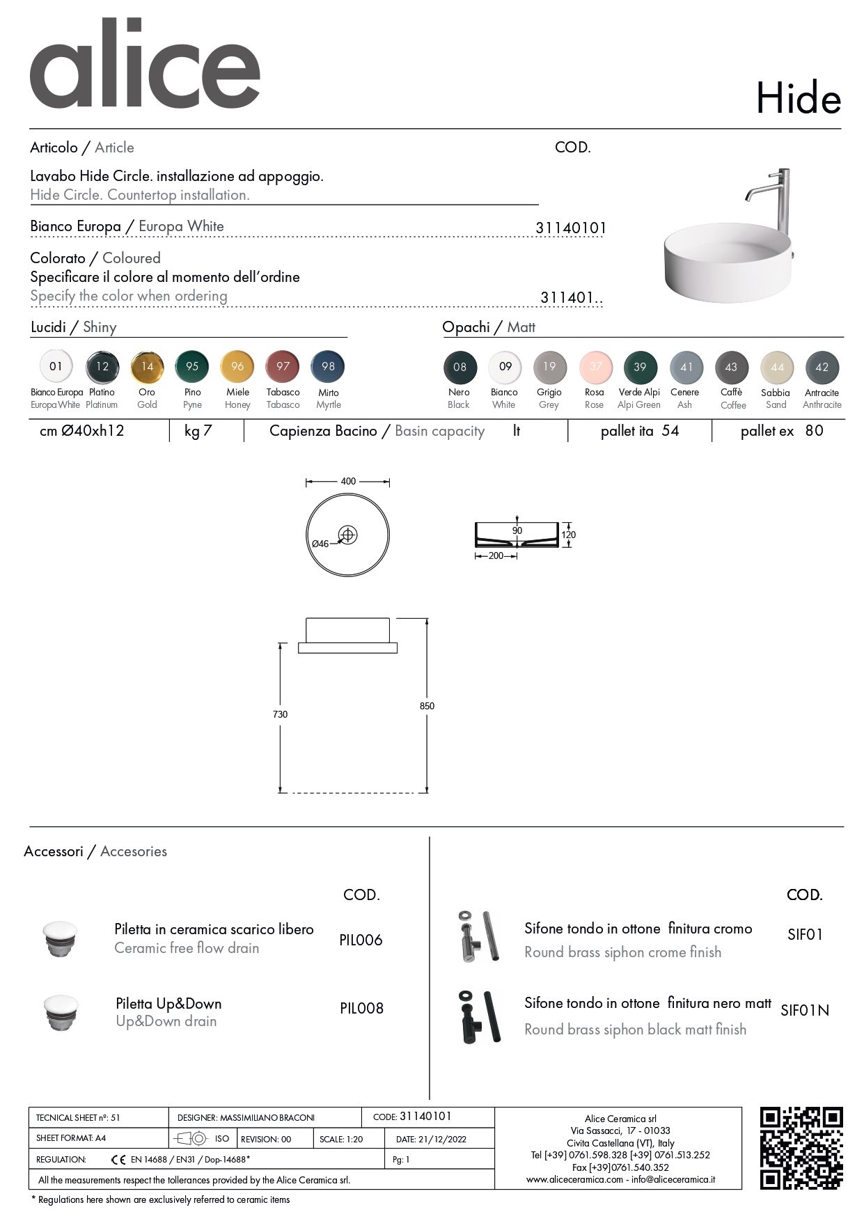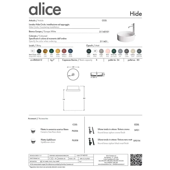 Накладная круглая раковина Alice Hide 40х12 см, белый глянцевый