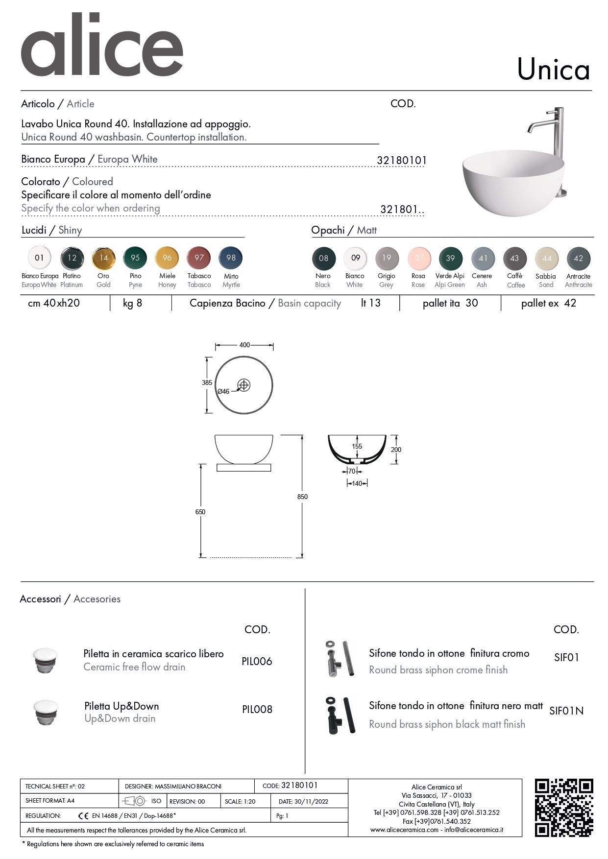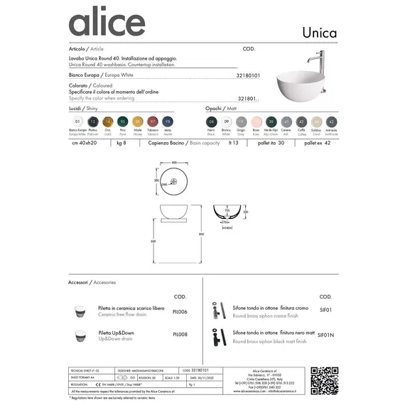 Накладная круглая раковина Alice Unica 40х20 см, белый глянцевый