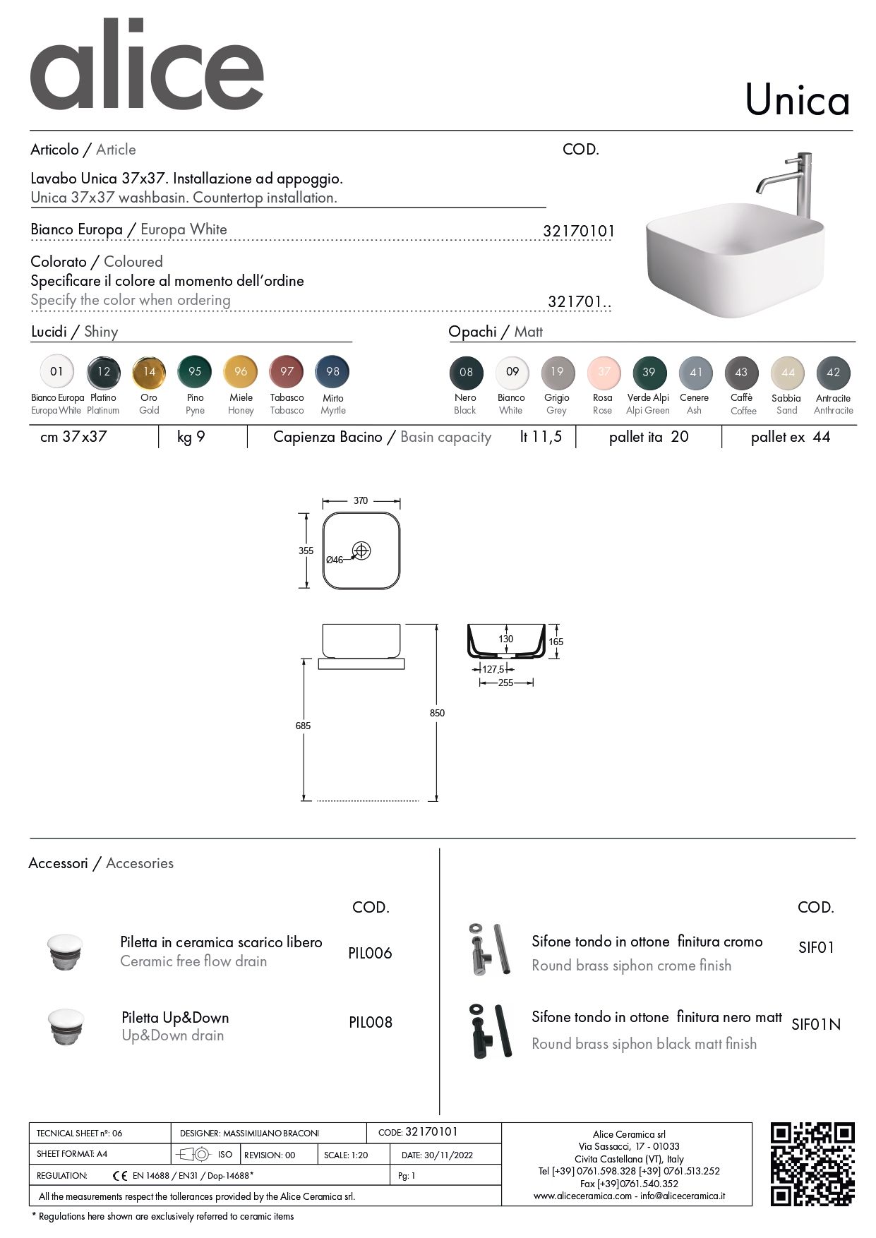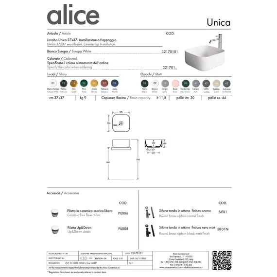 Накладная квадратная раковина Alice Unica 37х37х16,5 см, белый глянцевый