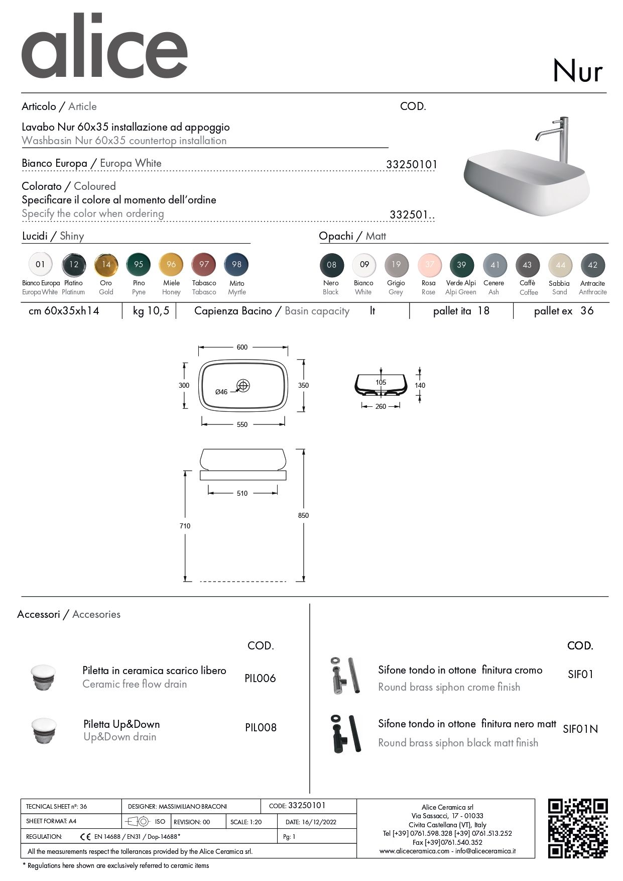 Накладная прямоугольная раковина с закругленными краями Alice Nur 60x35x14 см, белый глянцевый