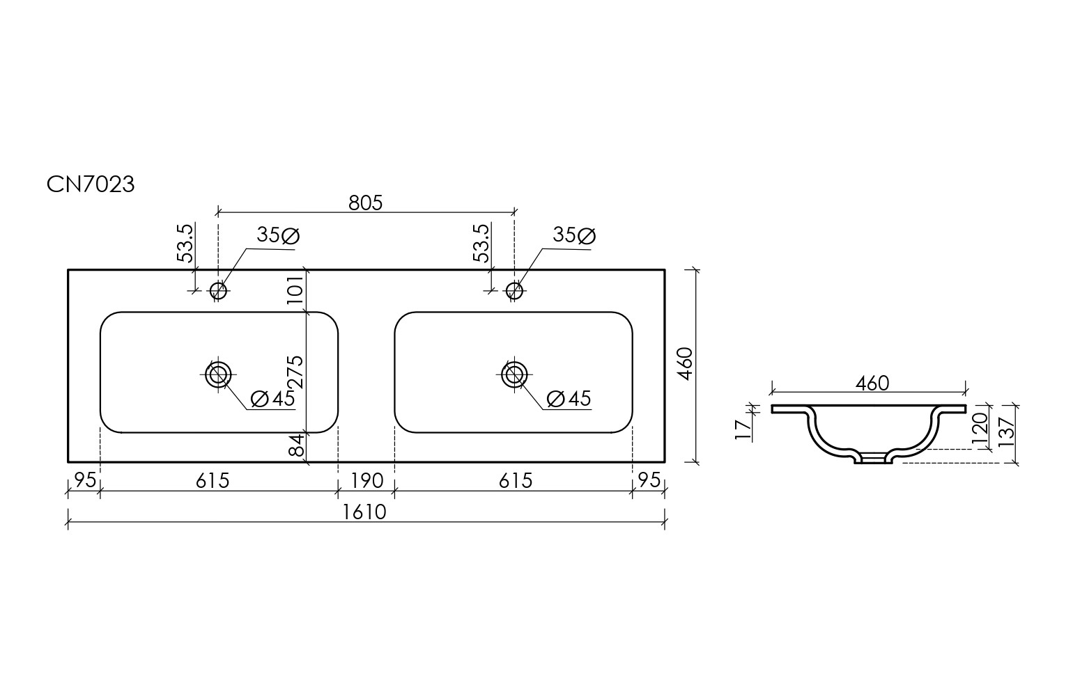 Раковина накладная мебельная CERAMICANOVA Grace прямоугольная 1610x457x137 мм с двумя чашами и отверстиями под смеситель, белый