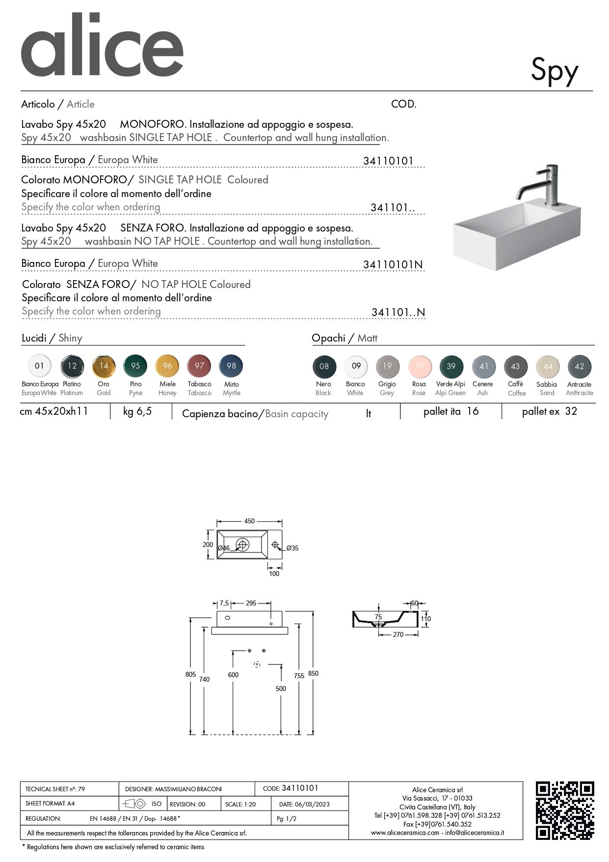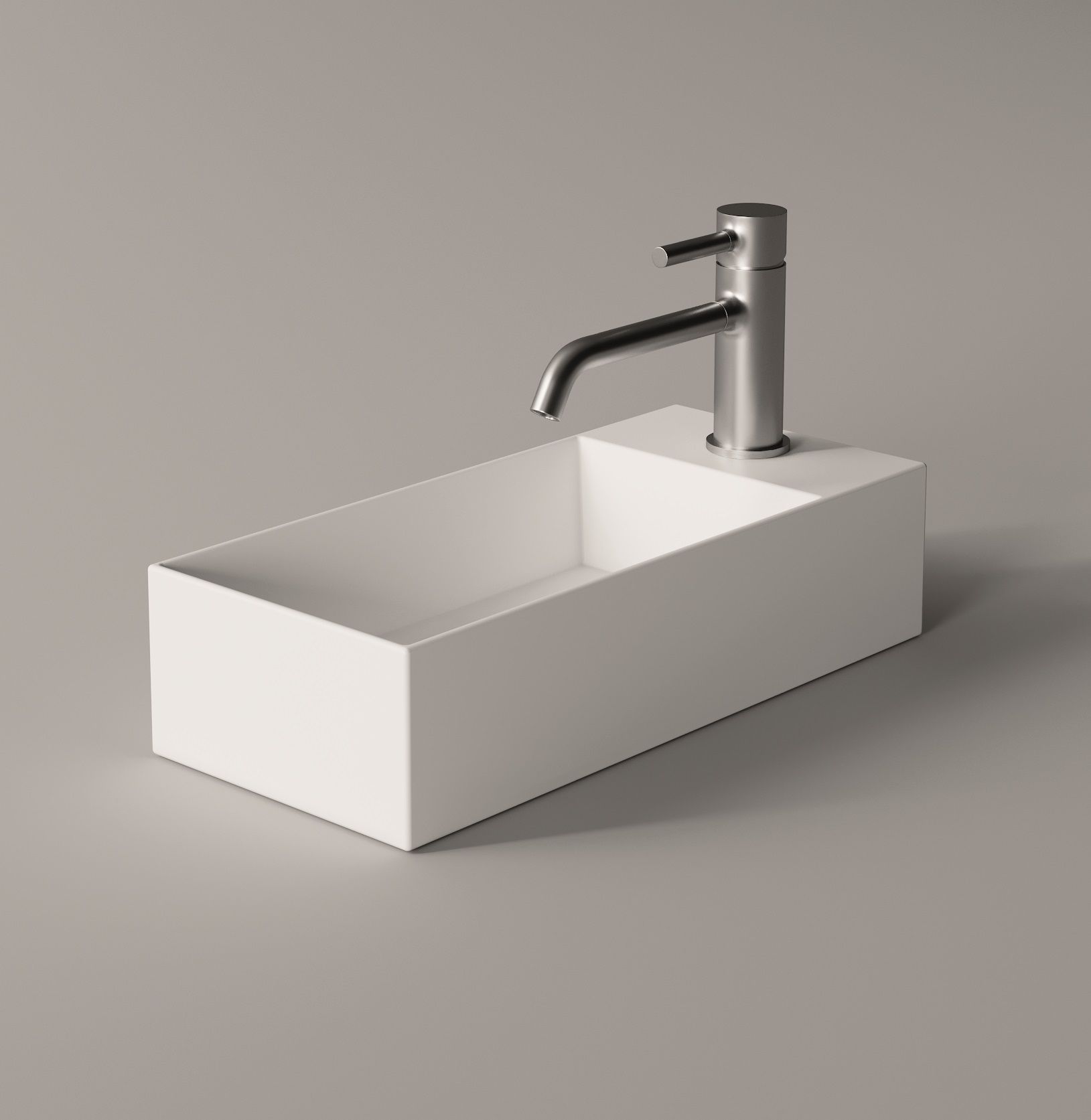 Подвесная прямоугольная раковина Alice Spy 45x20x11 см c крепежом FIX01, белый глянцевый