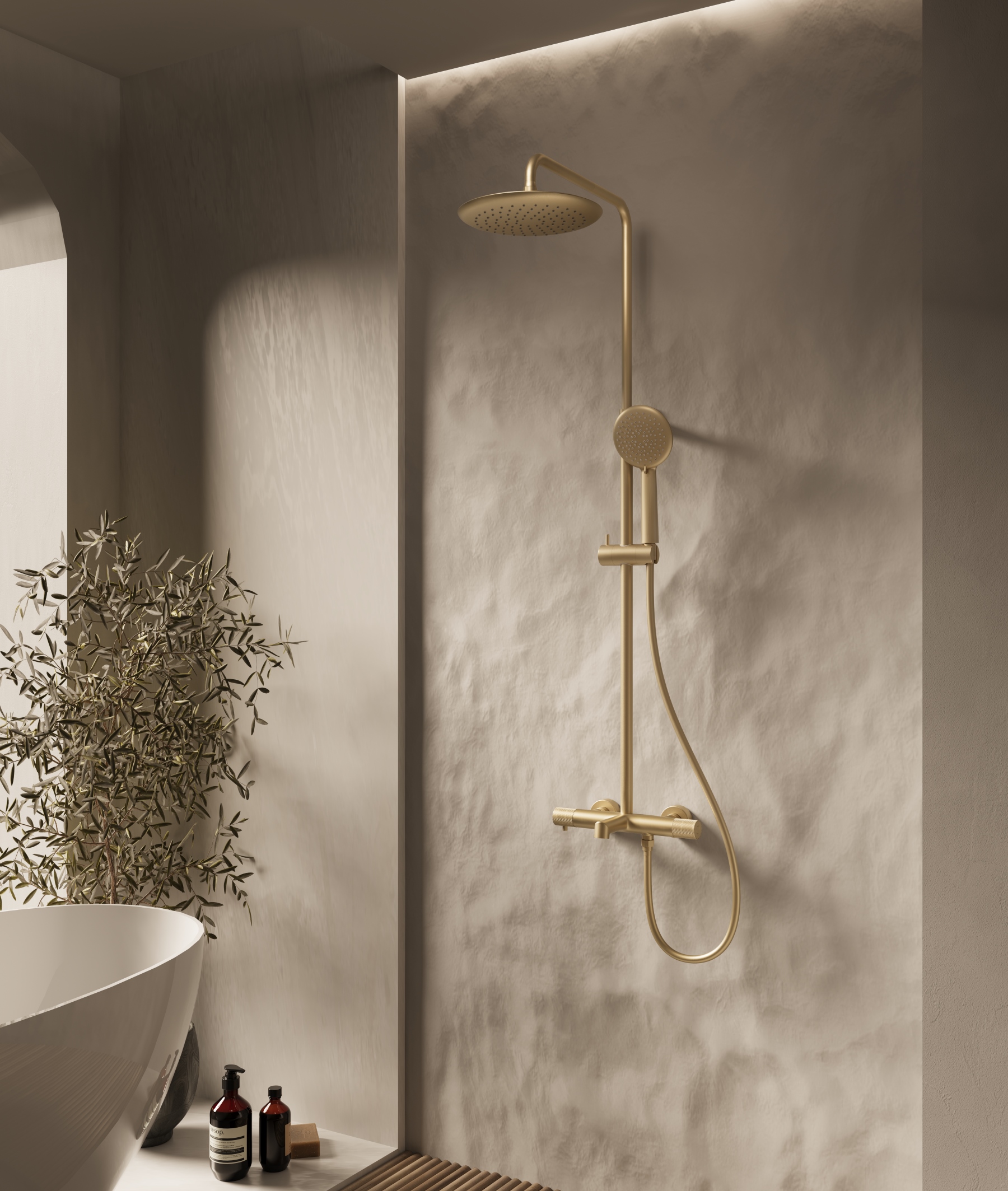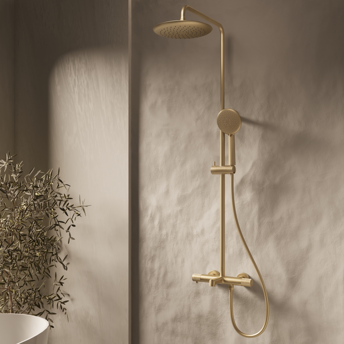 Душевая стойка Vincea Desire VSFS-1D1TBG термостатическая с изливом, 25см верх душ, брашированное золото