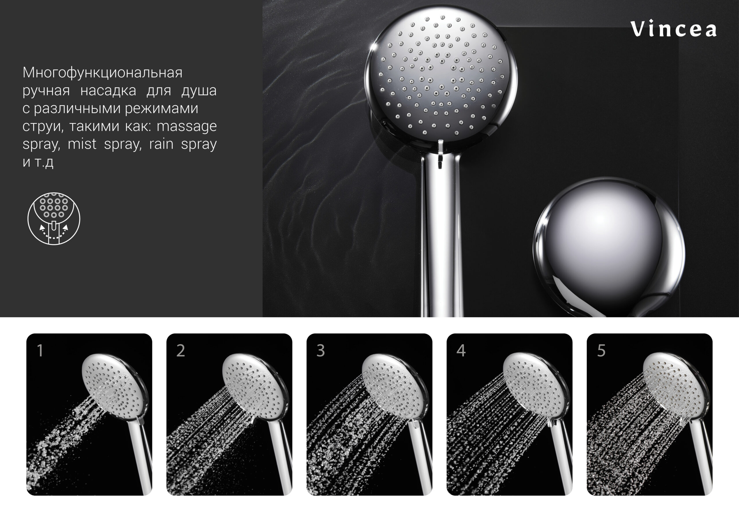 Пятифункциональный ручной душ.