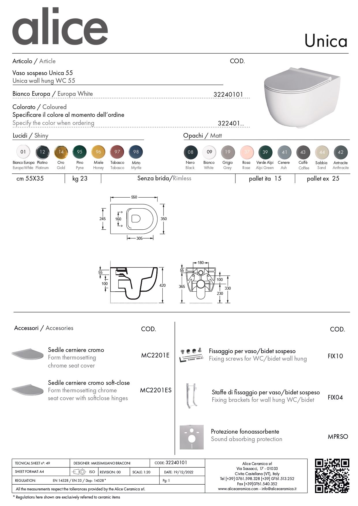 Подвесной безободковый унитаз c крепежом Alice Unica 55 FIX10, 55x35 см, белый глянцевый