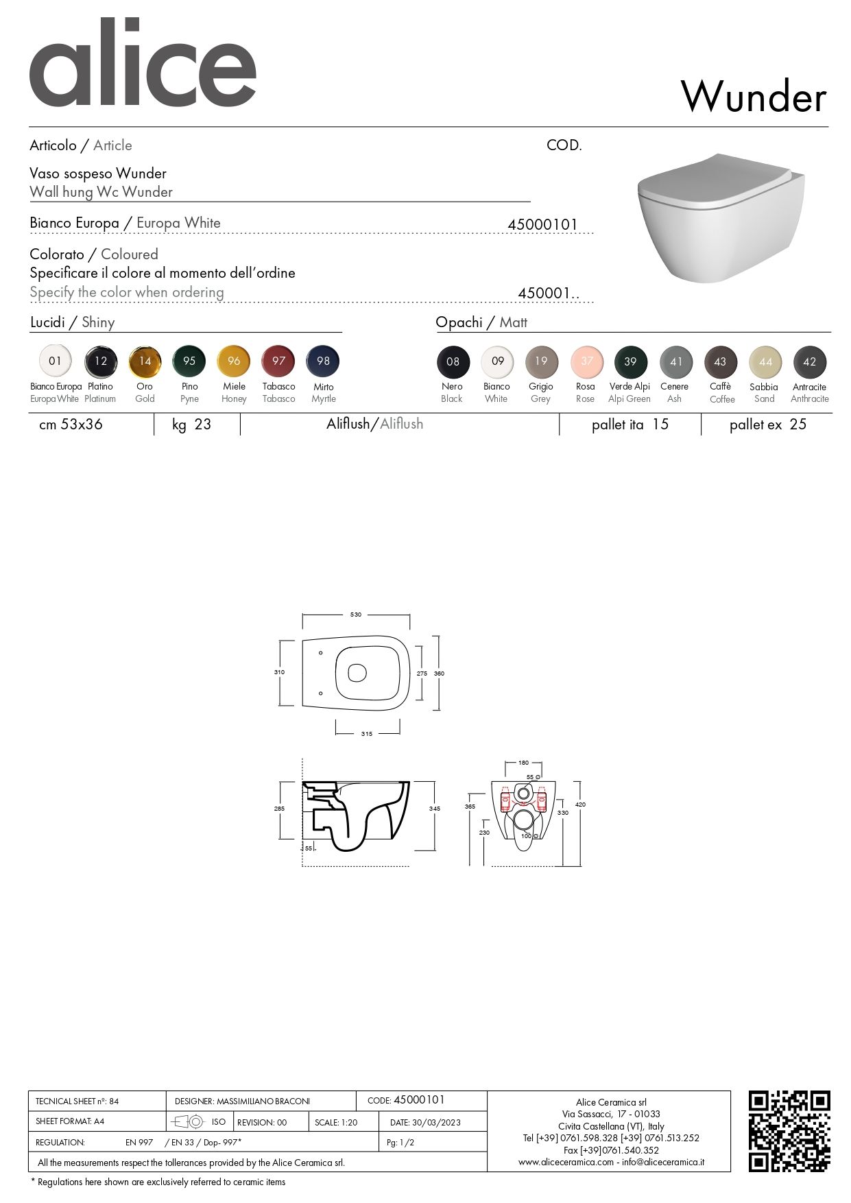 Подвесной унитаз с вихревой системой смыва и крепежом Alice Wunder FIXwunder, 53x36 см, белый глянцевый