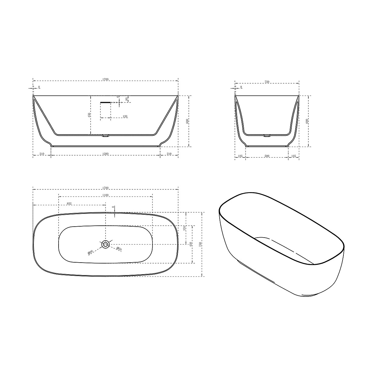 Ванна акриловая Vincea VBT-631, 1700*750*600, белый