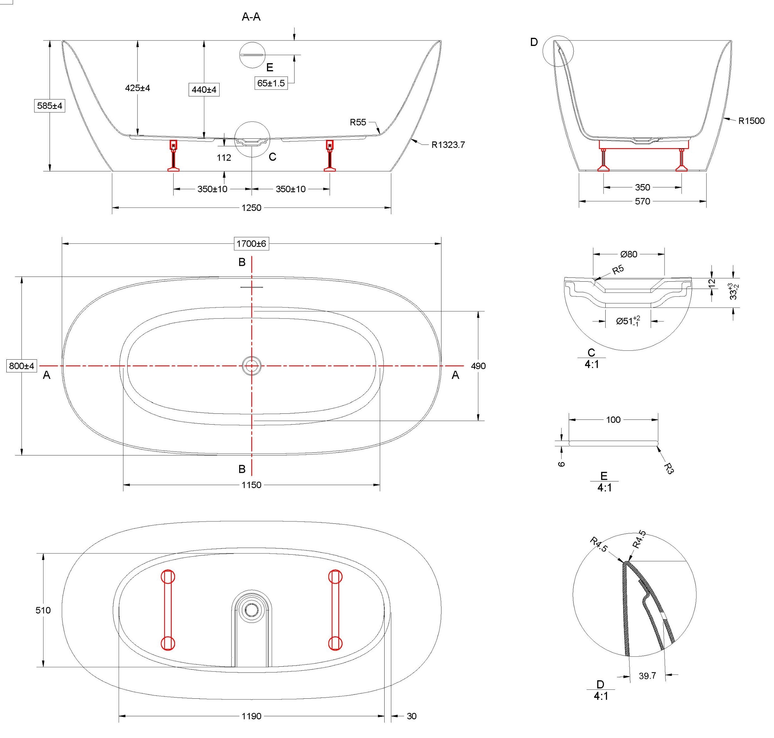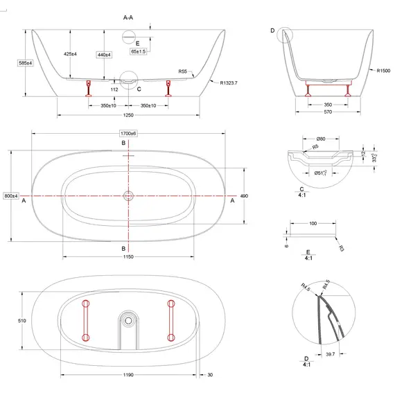 Ванна акриловая Vincea VBT-708-1700, 1700*800*585, белый