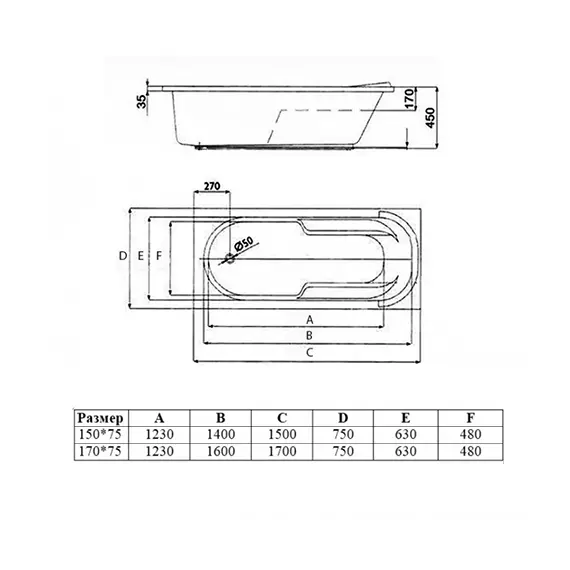 Ванна акриловая Vincea VBT-2A150-LG с ножками 1500*750*470, белый